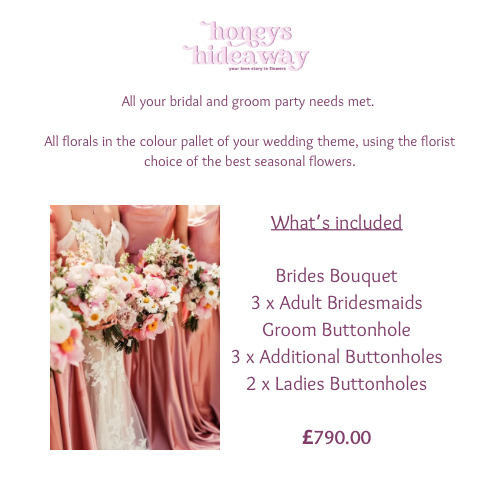 Decorate your wedding with flowers that work with your chosen colour palette and let us select the best foliage and seasonal flowers to create the florals for your magical day.